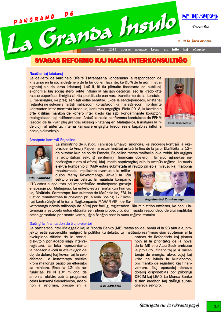 La decembra numero de Panoramo de la Granda Insulo invitas la leganton al riĉa kaj nuancita malkovro de Malagasio, inter aktualaĵoj, kulturo kaj ĉiutaga vivo. Tiu eldono proponas samtempe rigardon al la evoluo de la loka Esperanto-movado, meditojn pri nia kultura identeco, kaj analizojn pri aktualaj temoj, kiel la uzado de Artefarita Inteligento en la lando.